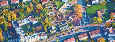 Unter der Überschrift „Veränderungen in der Gmünder Weststadt im Überblick“ berichtet die Gmünder Tagespost am 27.10.20 in sehr knapper Form über die städtebaulichen Veränderungen in der Weststadt Schwäbisch Gmünds. Begleitet und illustriert werden die Zeilen mit einem eindrucksvollen Luftbild, das die angesprochenen 5500 Quadratmeter Grundstücksfläche des Sonnentag-Wohnbauprojekts „Eutighofer Tor“ (westlich des Seniorenzentrums Paul-Gerhardt-Haus am linken Bildrand) sehr gut veranschaulicht. Der Baustart ist erfolgt, die Abbrucharbeiten am ehemaligen Gemeindezentrum Brücke haben begonnen. Foto: Dieterle Luftbildservice